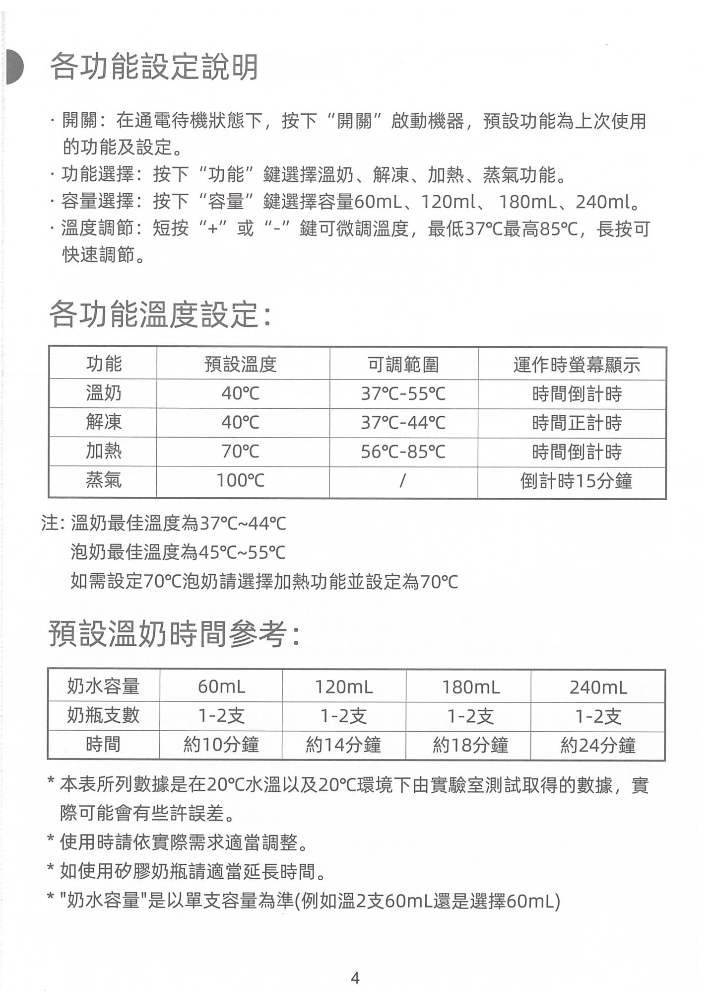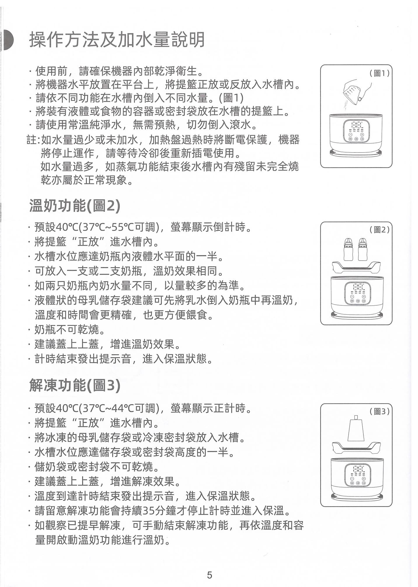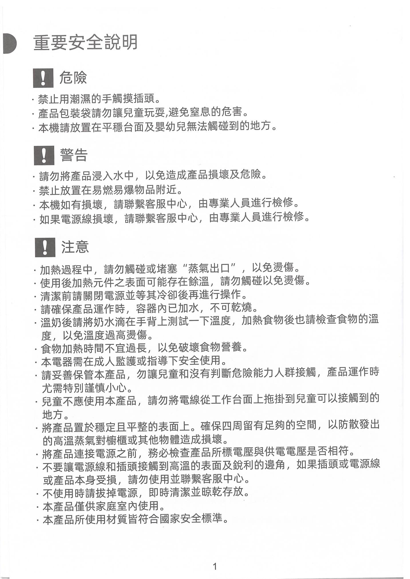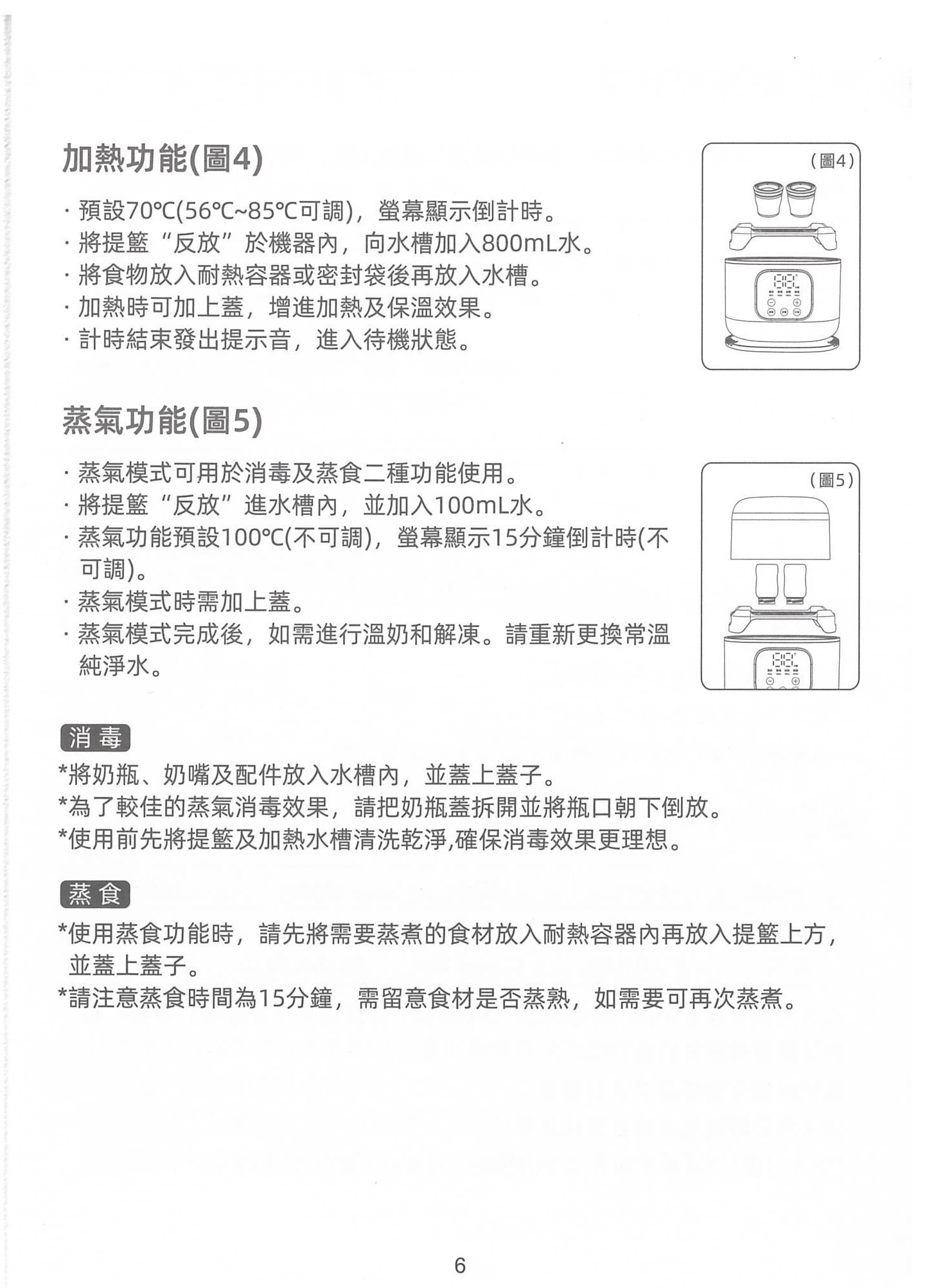 • 溫奶後請將奶水滴在手背上測試一下溫度,加熱食物後也請檢查食物的溫度,以免溫度過高燙傷。