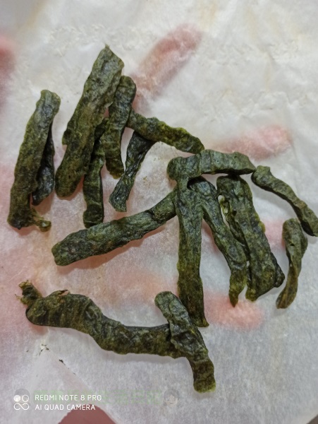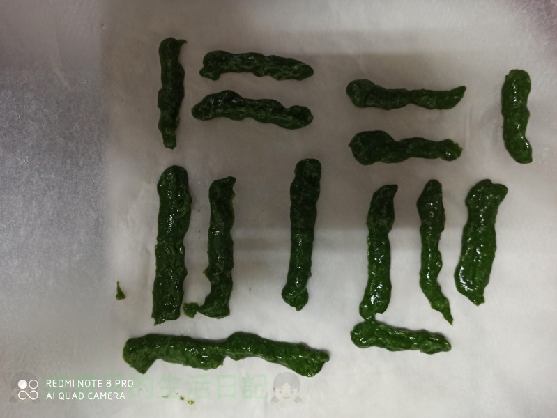 完成後將其中一份裝進袋子內,前端剪洞,在烘焙紙上擠成適合寶貝握的條狀,每一條要有留一點間距,放入電鍋內(不加水),待電鍋開關跳起後4分鐘後,再按下開關(重複3-4次後),將所有米餅翻面再按下開關一次,待開關跳起,完成後即可給寶貝吃!