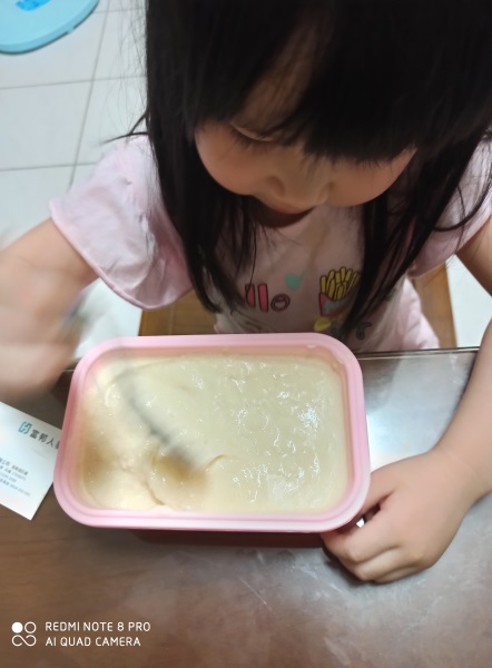 4、待一小時後將半成品拿出來攪拌,我請晴晴攪拌後再度放入冷凍庫內