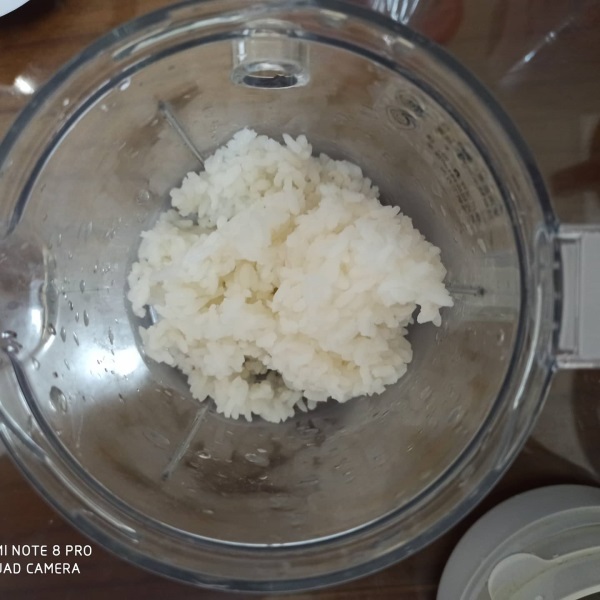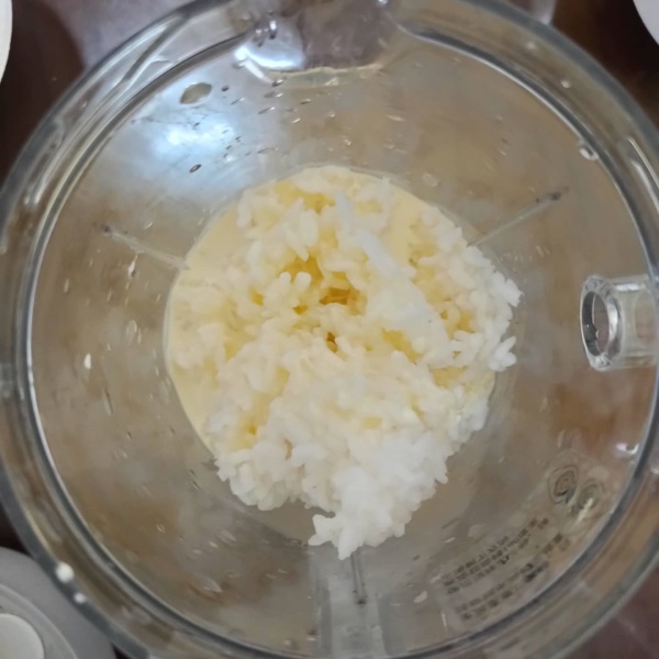 1、首先將米飯100g、鮮奶油和糖放入調理機內均勻攪拌,這個步驟我請晴晴幫我操作調理機。