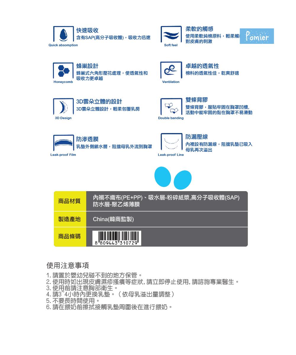 - 主要材質:內襯-不織布(PP+PE)、吸水層-粉碎紙漿+高分子吸收體(SAP)、防水層-聚乙薄膜(PE)