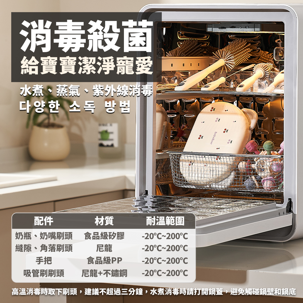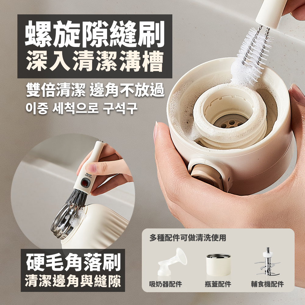· 將奶瓶各部件如瓶身、奶嘴、瓶蓋、吸管等分別用奶瓶刷、奶嘴刷、瓶蓋刷、吸管刷進行刷洗清潔。