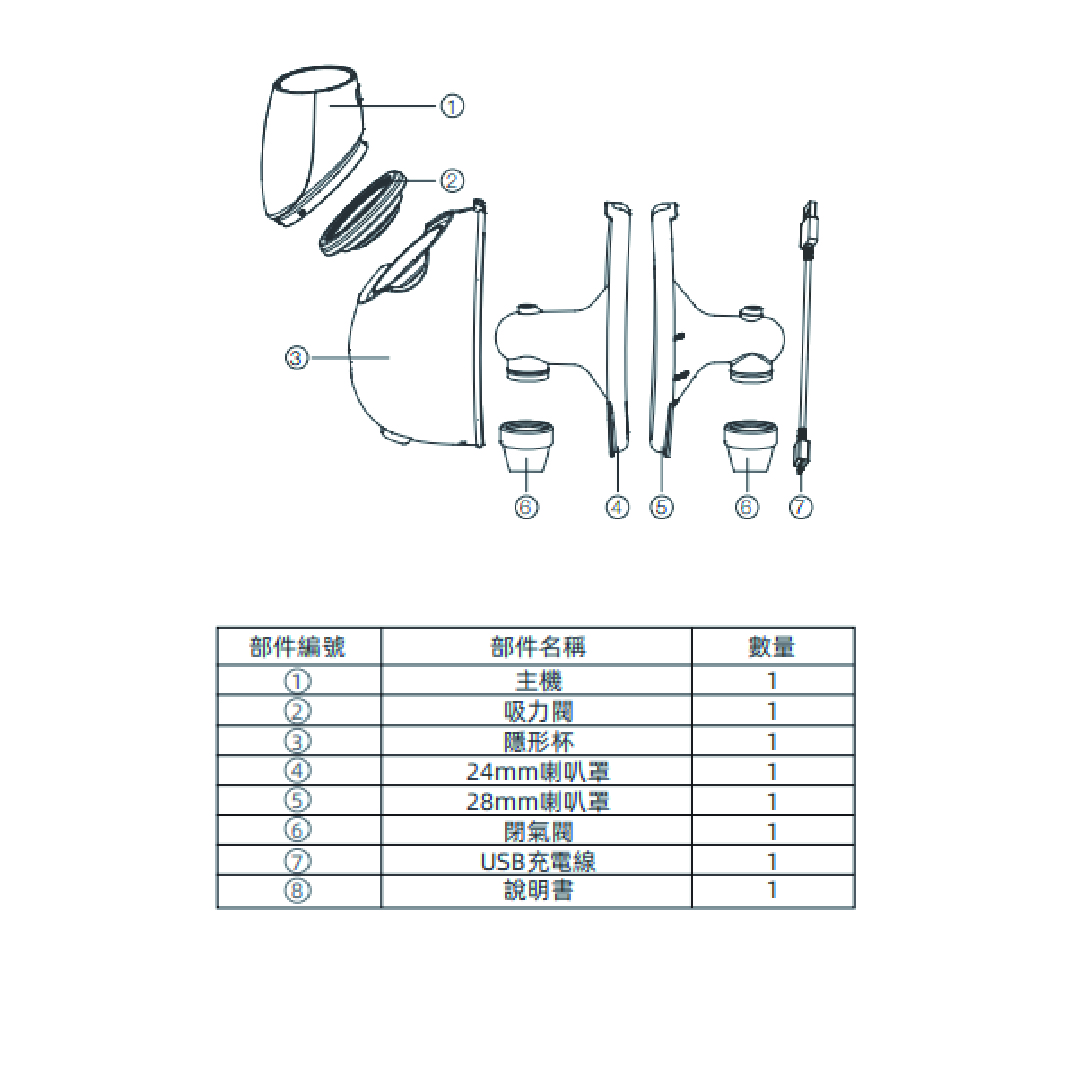商品內容物:主機X1、吸力閥X1、隱形杯X1、24mm喇叭罩X1、28mm喇叭罩X1、閉氣閥X1、USB充電線X1、說明書X1